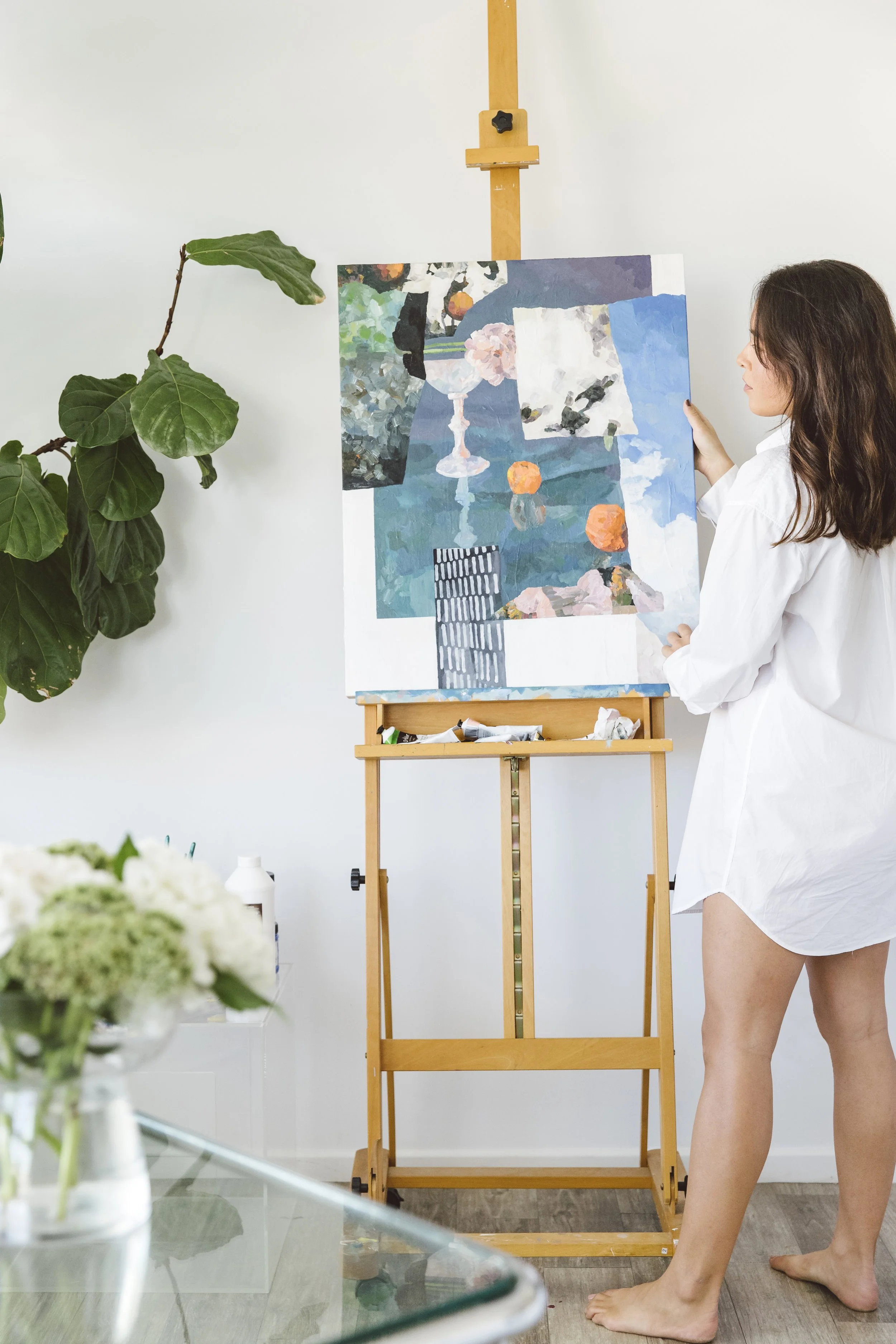 With painting as her primary medium, she moves between collage and still life, guided by colour, texture, and form.